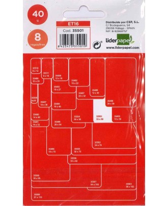 As etiquetas adesivas LIDERPAPEL são a solução perfeita para todas as suas necessidades de organização e etiquetagem. Vêm num cómodo envelope de 10 folhas mais 2 folhas livres, com um tamanho de 24x38 mm e 9 unidades por folha, proporcionando uma excelente relação qualidade/preço.